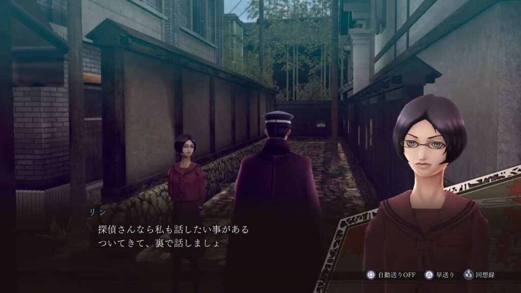 リンさんは、最初ライドウ達に不信感を示しましたが、探偵事務所の者であることを話すと、警戒心を解いてくれたようです。裏で話をするためについて行きますが…