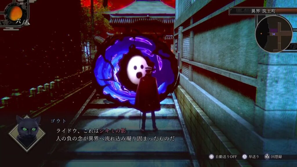 何か訳の分からない空間に引きずり込まれてしまいます。歳がバレるけど魔空空間っぽい。まぁ異界に引きずり込まれているんで、あながち間違いではないのかな。あぁでも異界っていったらSDK…。ゴウトが異界って言っていますが、この異界にもSDKはやって来るんでしょうかね。気になります。まぁそれは置いておいて、名もなき神社に行って、異界開きというのをやってもらわなければいけません。