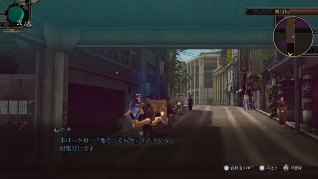 というわけで銀座です。奥の方に見えるのは和光ですかね。この時代でもやっぱり都会ですね。オサレなカフェーなどがあるんでしょう。そんな余裕はないのでとっとと聞き込みに行きます。