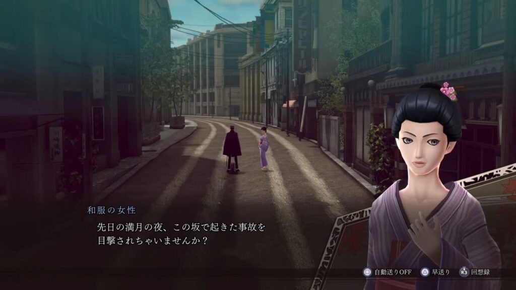 事故の目撃者を探す女性が。これも赤マントに関係あるのかな。ただの事故?現時点ではこれ以上の情報を得られません。そういえば、この辺りに鳴海さんがツケを溜めている料亭があるので行ってみますか。