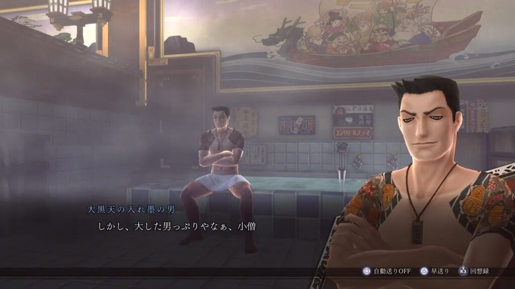 それで中に入ると体に絵が描いてある皆さんが絡んできたので、ボコしてやりました。まぁ魔物を相手にしているライドウですから、大したことじゃないですね。すると、奥にいるアニキ的な方が声を掛けてきます。