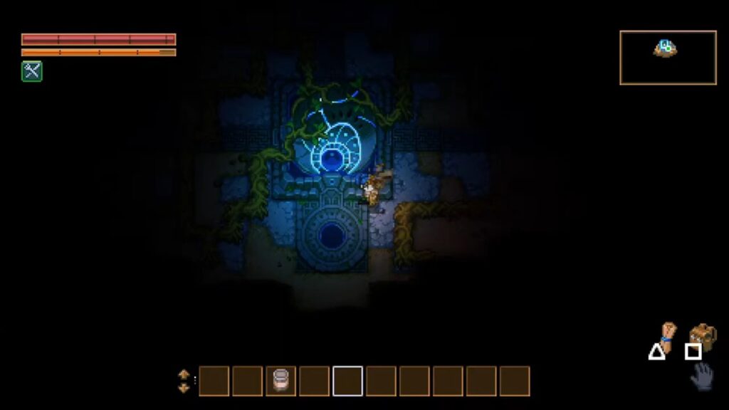 R2ボタンで何か根っこみたいなのが壊せました。ああ、こういう感じでやっていくのね。壊した木を使って松明とか道具とかを作っていくようです。