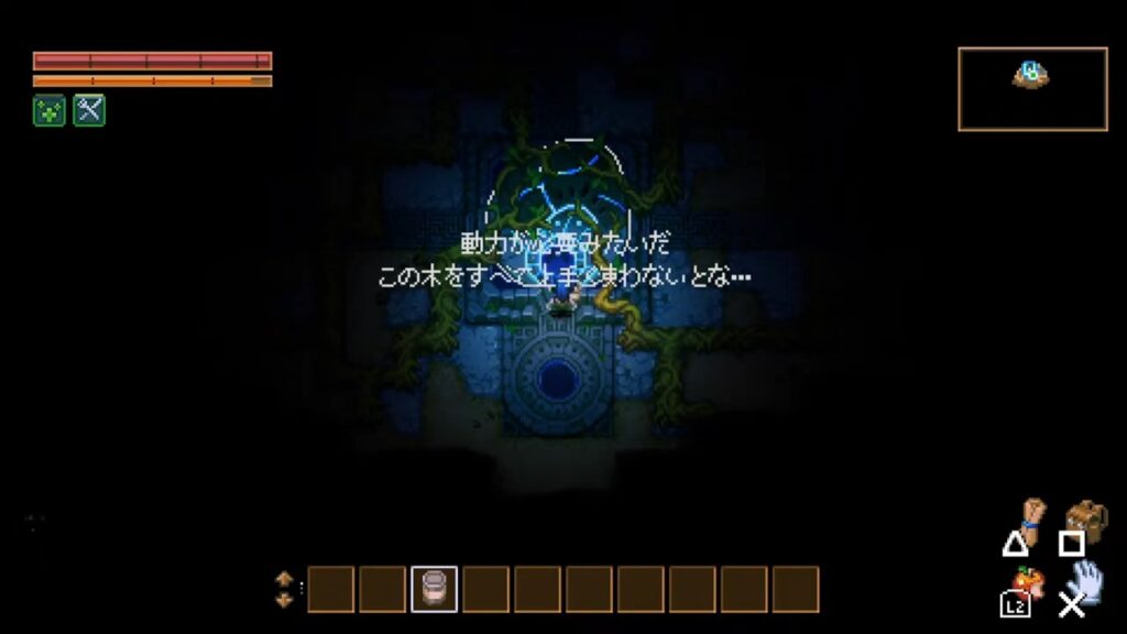 いきなり暗いところに放り込まれ、あげく操作説明がないまま始まったのでかなり戸惑いました。何か木みたいなのに阻まれて進めないし…!と思ったらR2(PS5版なので)で木を切ることができます。