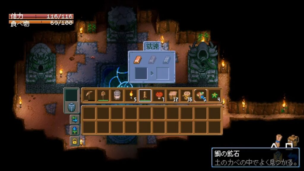そんなことを繰り返しつつ地下探索。キノコを倒したりしながら先に進みます。銅の鉱石も集めて、金床を作ったり。金床を作れると、金属製の武器が作れるようになります。