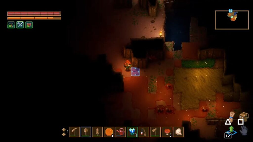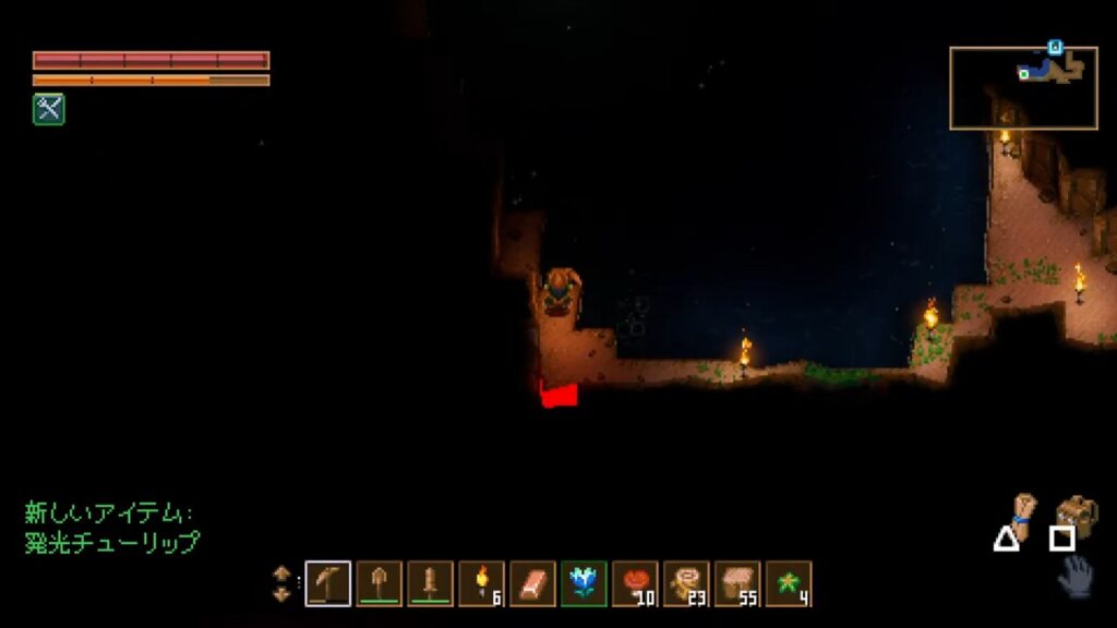 少し先の方に行くと、こんな風になんかオレンジ色の床が出てきました。スライムと同じ色で、歩くとなんかもったりします。クワで耕すとこのオレンジ色の床が取れます。これ、なんかに使えるのかな?一応取っとこう。こういう系のゲームって、何に使うか分からないからアイテムをとりあえず箱にしまいがち。